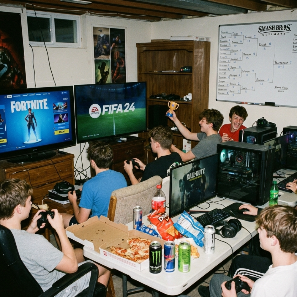 Venue: Home (basement, garage, or living room with multiple TVs), gaming cafe if available