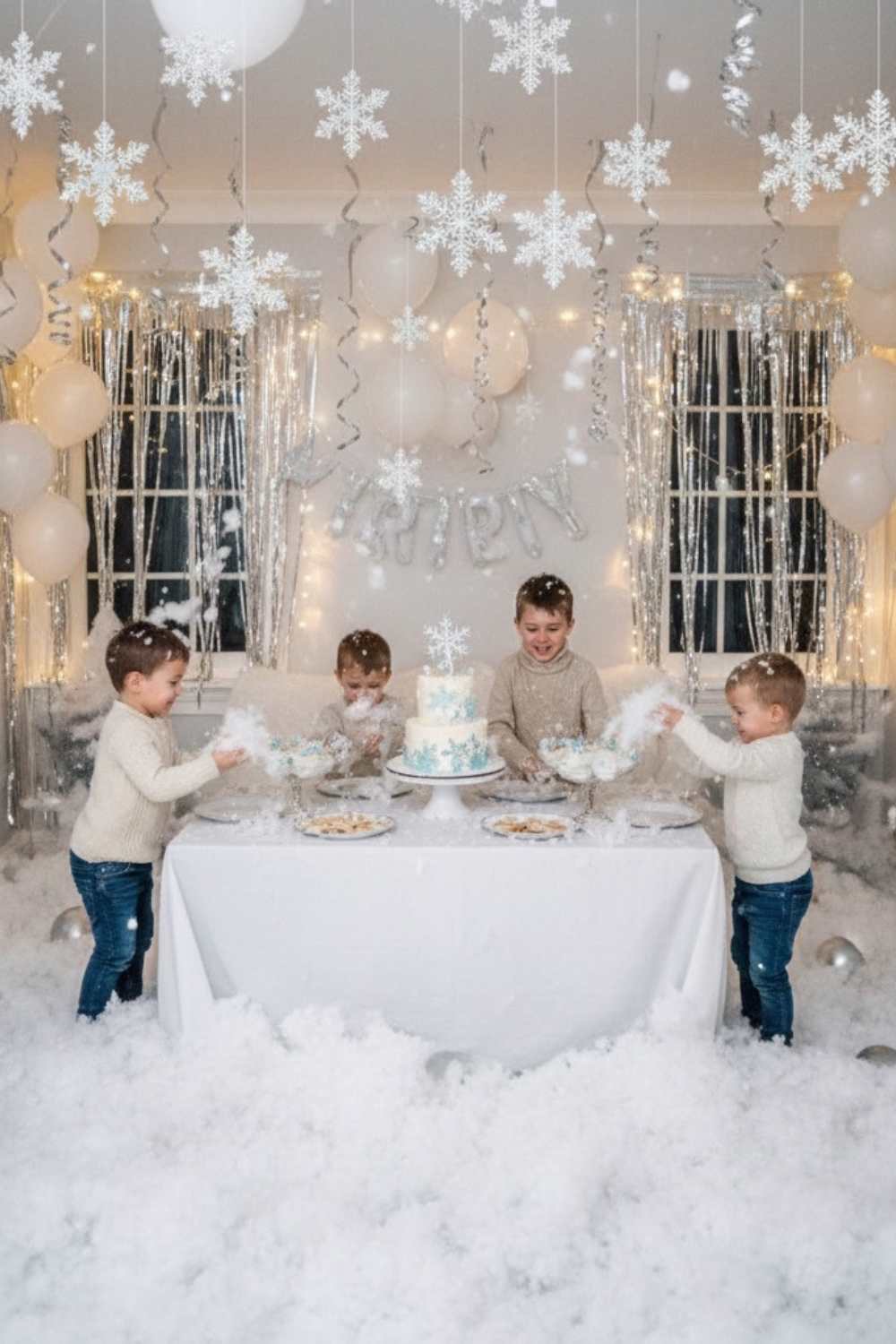 Set up different winter activity areas: snowflake crafts where kids make paper snowflakes and decorate them with glitter, a “build a snowman” station using white balloons, cotton balls and construction paper accessories and a hot chocolate bar where kids can make their own drinks with marshmallows, whipped cream and peppermint sticks.